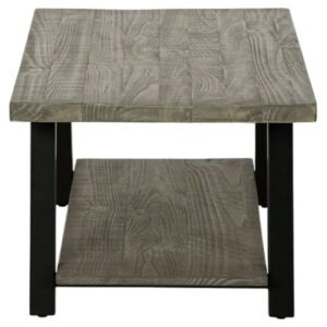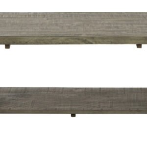 - Tabletop and shelf have weathered gray textured finish