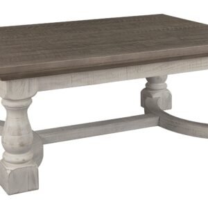 With its richly rustic finish and textural mix, this cocktail table goes to town on bygone beauty. Its distressed two-tone treatment blends a weathered gray with vintage white for an utterly charming effect. Robust legs lend a hearty, substantial look that feels right at home.