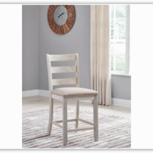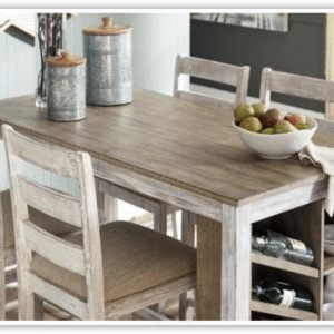 Included are four counter-height upholstered bar stools, each made of solid wood with a distressed grayish-white finish. The classic ladderback styling of the stools adds high style to your dining area, while the comfortable cushioned seats upholstered in polyester provide a cozy and stylish seating experience. Assembly is required, ensuring a personalized touch to your space. Experience the perfect blend of aesthetics and functionality with the Skempton Storage Counter Height Dining Set, where simplicity meets sophistication.