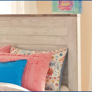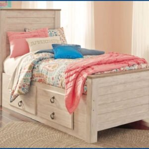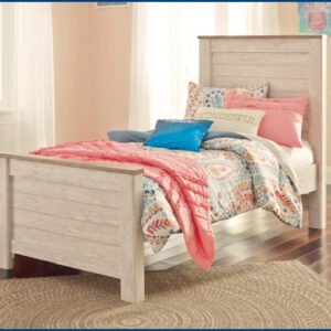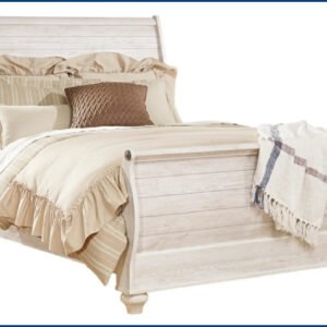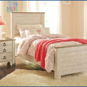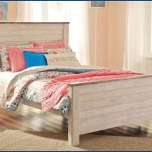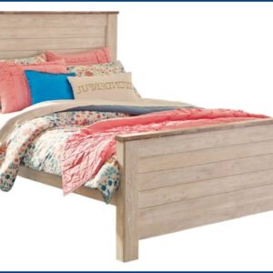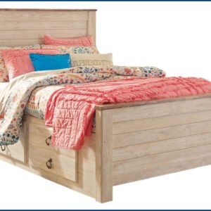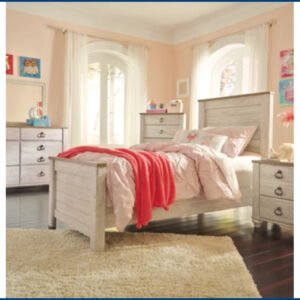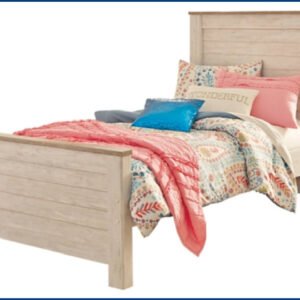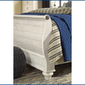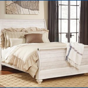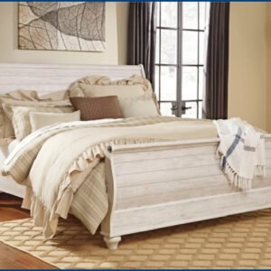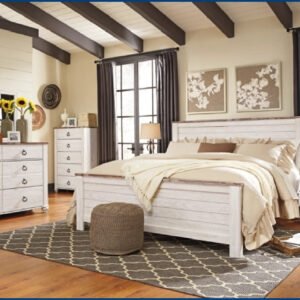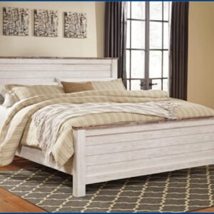 Willowton Bed Collection. Two-tone finish in white wash replicated worn through paint with authentic touch and a replicated wood-grained block pattern with authentic touch. A large-scaled shapely bedroom collection features bun feet. Ring pull hardware in an antique brass color, accented with white paint hang up. Side roller glides for smooth operating drawers.