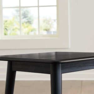 An always-trendy complement to modern decor, this table set creates a casual vibe. Its ever-classic satin black finish allows the textural wood grain to peek through. A bullnose edge tabletop, canted round legs, and a wide plank stretcher complete each table’s sturdy, well-grounded silhouette.